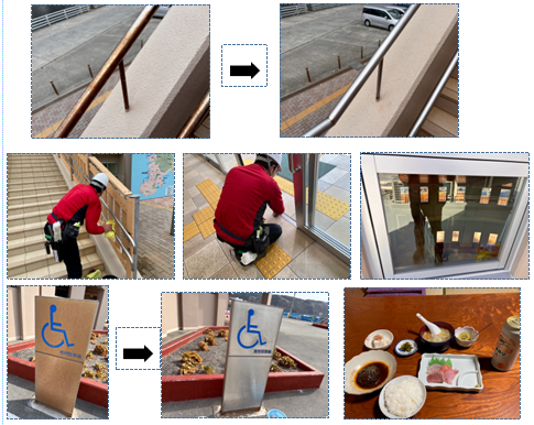 作業はウッドデッキと石材の高圧洗浄、ガラス清掃、手摺りの錆落とし。